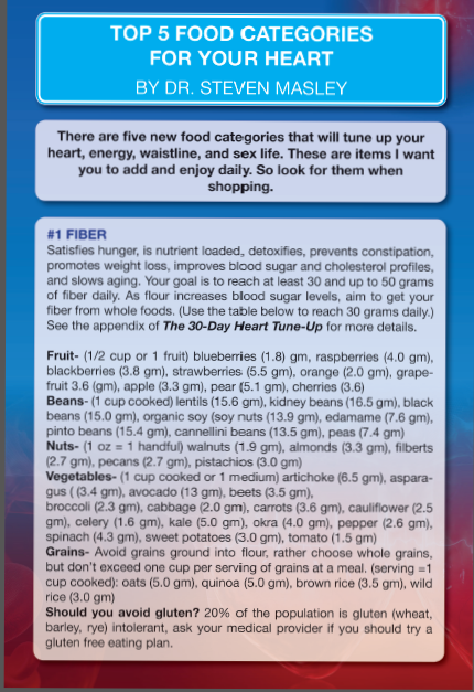 يقول د/ ستيفن أن هناك خمس فئات جديدة من الأغذية لتحسين حالة قلبك وطاقتك “ومحيط خصرك” وقدراتك الجنسية. فهو يتحيز لكل ما فيه صحة الإنسان وقوته، لذا ينصح بإضافة هذه العناصر إلى الوجبات اليومية للاستمتاع بها والبحث عنها عند الذهاب للتسوق.