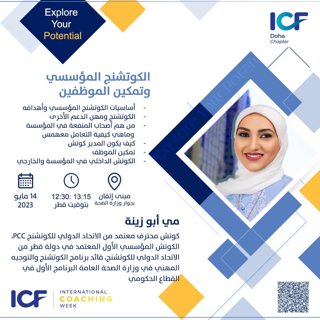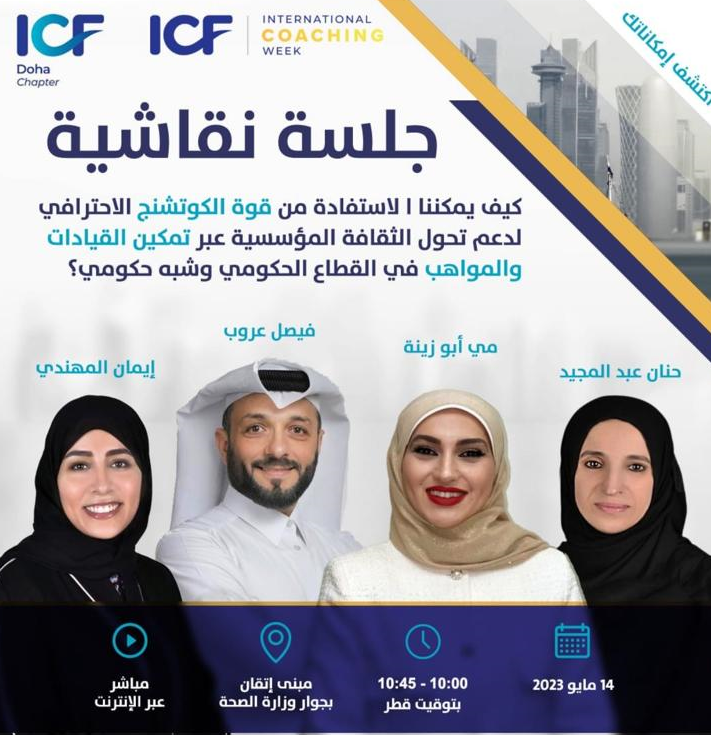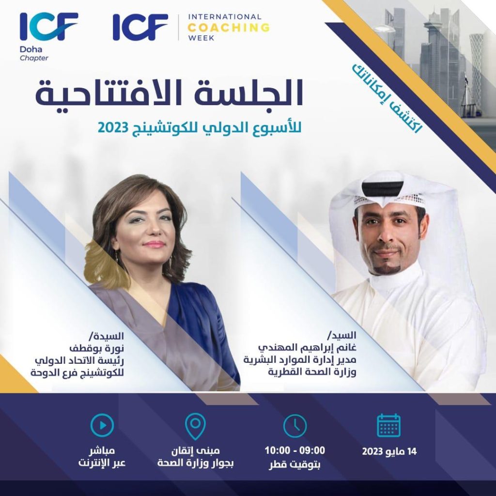 حيث تم عقد الجلسة الافتتاحية، والتي القت فيها رئيسة الاتحاد نورة بوقطف كلمة ترحيبب بالحضور و مباركة لرعاية وزارة الصحة القطرية، ثم تلى ذلك جلسة نقاشية باللغه العربية قادتها كوتش مي أبو زينة دارت حول (كيف يمكننا الاستفادة من قوة الكوتشنج الاحترافي لدعم تحول الثقافة المؤسسية عبر تمكين القيادات والمواهب في القطاع الحكومي وشبه الحكومي).