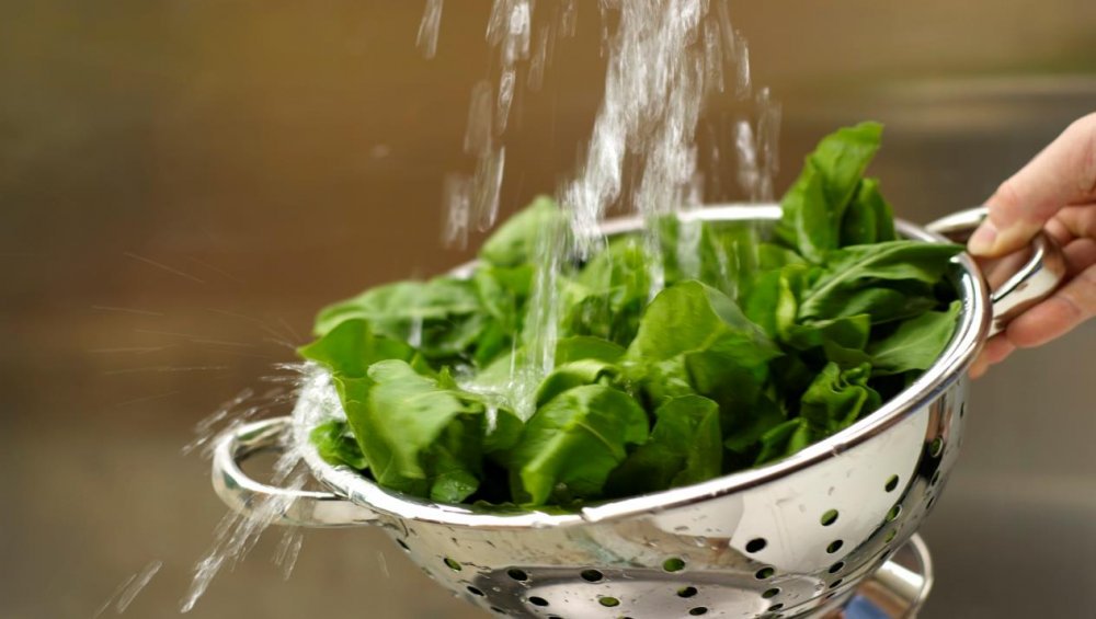 قومى بغسل الخضروات الورقية بفصلها عن بعضها البعض ، ثم انقعيها في الماء والخل ويمكنك إضافة قطرات من عصير الليمون لزيادة التخلص من المبيدات ، ثم اغسلى الخضروات ورقة ورقة .