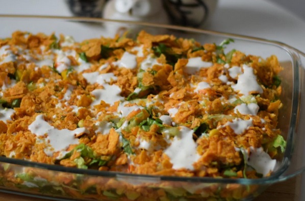 - قومي بوضع طبقة من الشيبس ومن فوقها الخليط الذي سبق تحضيرة.