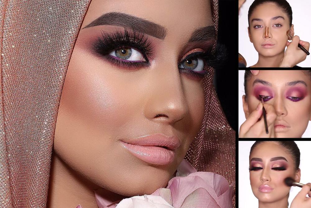 - ولنظرات وإطلالة ساحرة أيضًا يمكنك توزيع ظلال زهرية متدرجة، مع بناء لون لمكياج سموكي، وقومي بدمج ظلال ميتاليك براقة معه بتدرجات فضية وذهبية وجليتر، على زوايا العين الداخلية وعلى الجفون السفلية المتحركة، ومن الممكن أن تمرري كحل أسود بطريقة جريئة ومجنحة، ووضع ظلال زهرية الترابية الممدودة والمات على الجهة الداخلية للعين بشكل كامل.